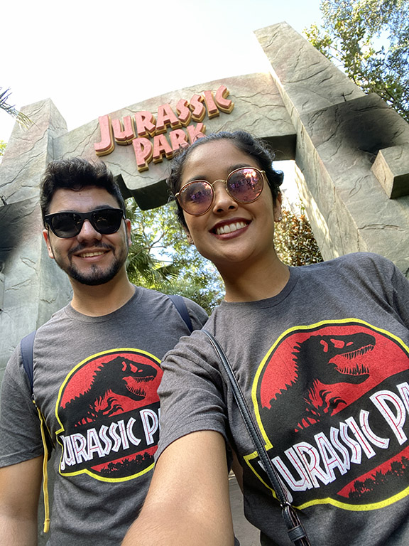 Dali, seguimos para a área do Jurassic Park e, dessa vez, fomos até uniformizados porque amamos a franquia de filmes, kkkkk. Bom, apesar de gostarmos bastante, as atrações são meio antiguinhas (por enquanto, já demos aqui no blog que vem aí uma montanha-russa para essa área e eu já estou animadíssima! Hahahahah), como a Jurassic Park River Adventure, basicamente um splash bem legal com os dinossauros. As outras são mais voltadas para as crianças, mesmo assim é muito divertido.