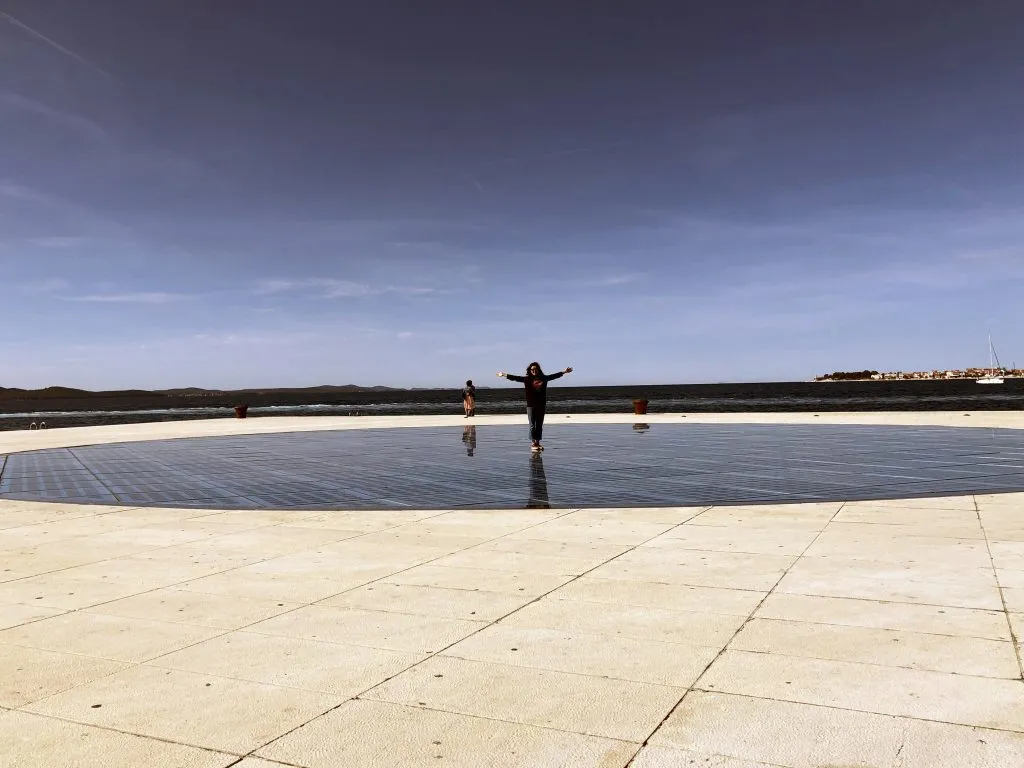 Aqui está um dos símbolos da Zadar moderna ao lado da antiga. Na ponta da península, o The Greating to the Sun é fácil de ser encontrado e foi o motivo de voltarmos à cidade antiga à noite. Já tinha visto na internet e em vídeos no Youtube essa moderna instalação, mas ao vivo foi diferente. Fomos durante o dia conhecer os 300 painéis com múltiplas camadas de vidro que formam um círculo com diâmetro de 22 metros. Até aí, beleza. Durante o dia, ele coleta a energia do sol, mas é a noite que a coisa se transforma.