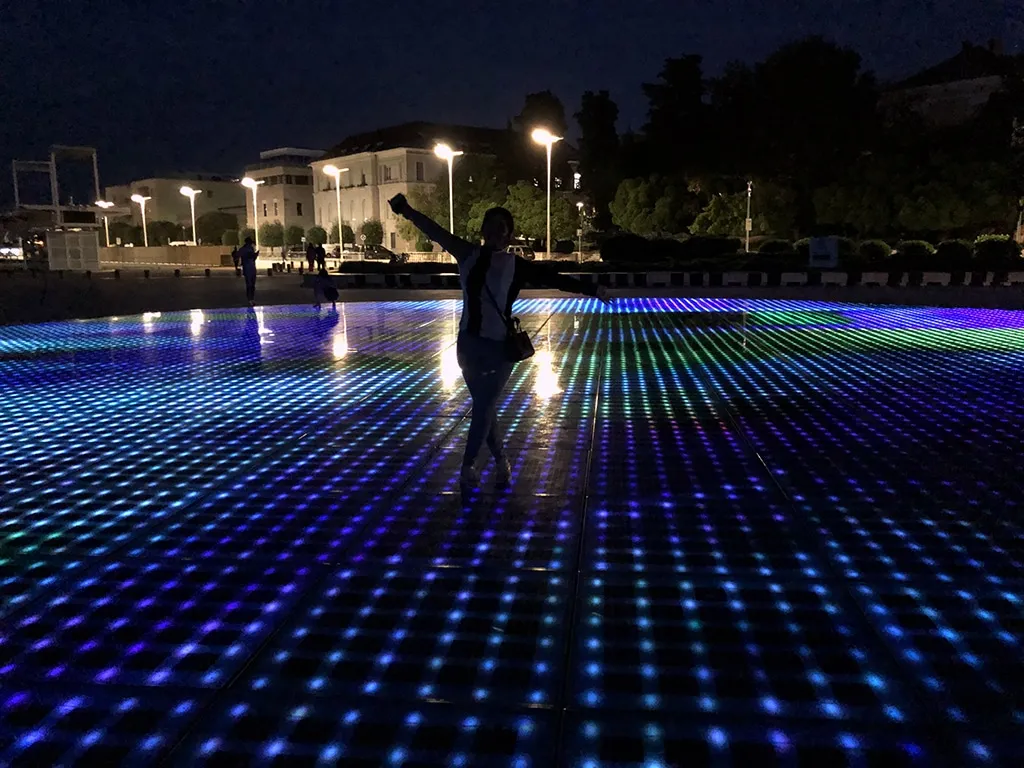 Quando escurece, ele passa a consumir em forma de eletricidade, a energia que ele coletou durante o dia para se transformar em cores e desenhos. É bem bonito de se ver, as projeções e luzes vão mudando conforme passa o tempo em uma espécie de uma “dança”. Ao fundo, você escuta o som produzido pela outra atração turística ali daquele lugar: o Órgão do Mar.