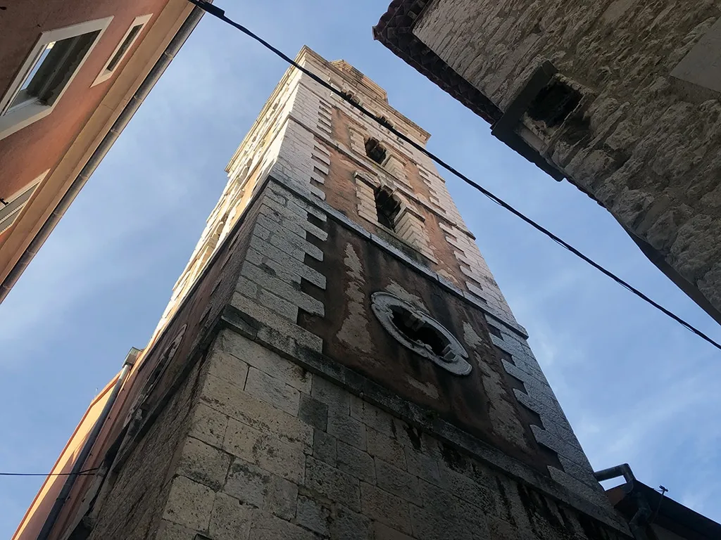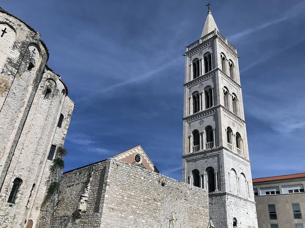 Praticamente na frente do Fórum Romano, ao lado do Museu Arqueológico, está a Igreja e Convento de Santa Maria. Com três naves, a igreja foi construída em 1091, no início do estilo romântico – assim como sua torre de sino. É possível visitar uma Exposição Permanente de Arte Sacra – Ouro e Prata de Zadar, dentro do convento (nós optamos por não fazer esse passeio), que possui cerca de 200 objetos que datam do século 8 ao 18.